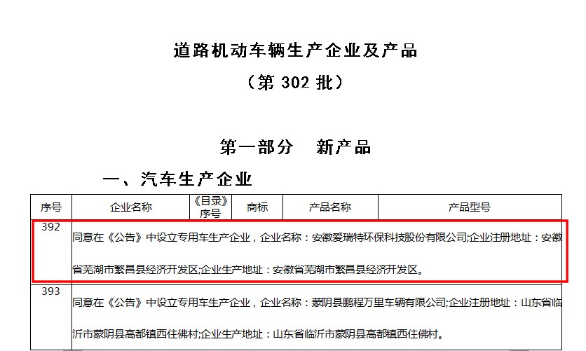 2017年獲國家工信部頒發“專用車生產資質”愛瑞特產業園建成投產;形成年產新能源環衛車3萬臺、產能達20億規模專用汽車生產企業;2018年公司正式更名為“安徽愛瑞特新能源專用汽車股份有限公司”