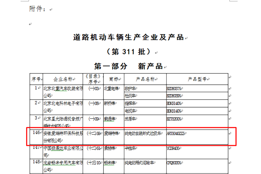 愛(ài)瑞特于2017年12月4日正式通過(guò)中華人民共和國(guó)工業(yè)和信息化部公布的道路機(jī)動(dòng)車輛生產(chǎn)企業(yè)及產(chǎn)品(第302批)公告,正式獲得汽車產(chǎn)品生產(chǎn)及銷售許可;2018年9月6日“愛(ài)瑞特”牌ART5040ZZZY50BEV型純電動(dòng)自裝卸式垃圾車正式列入工信部產(chǎn)品公告目錄(第311批)。